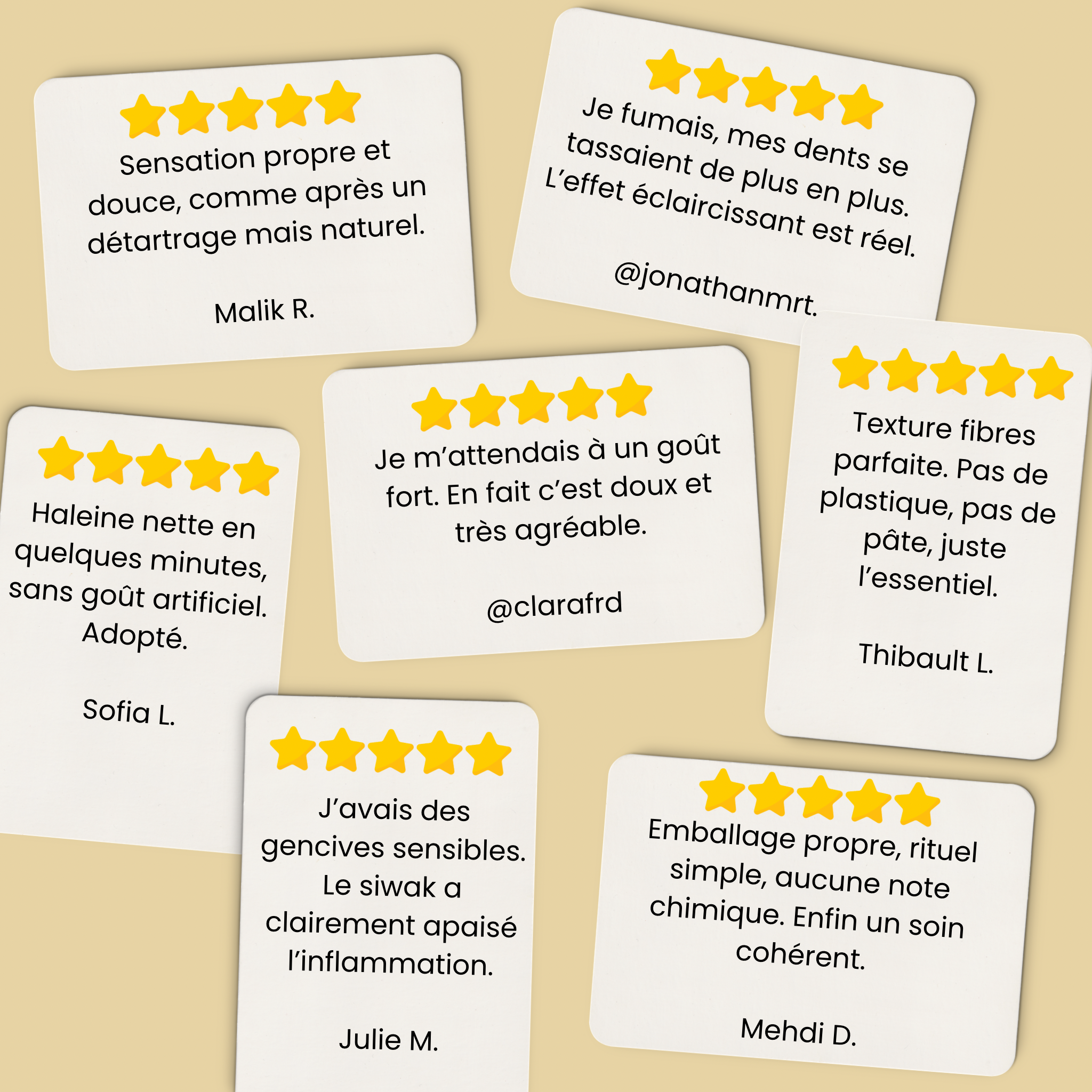 Le siwak peut être utilisé seul, mais beaucoup de nos clients préfèrent alterner entre siwak et brosse à dents pour un rituel plus complet. Les deux sont compatibles.