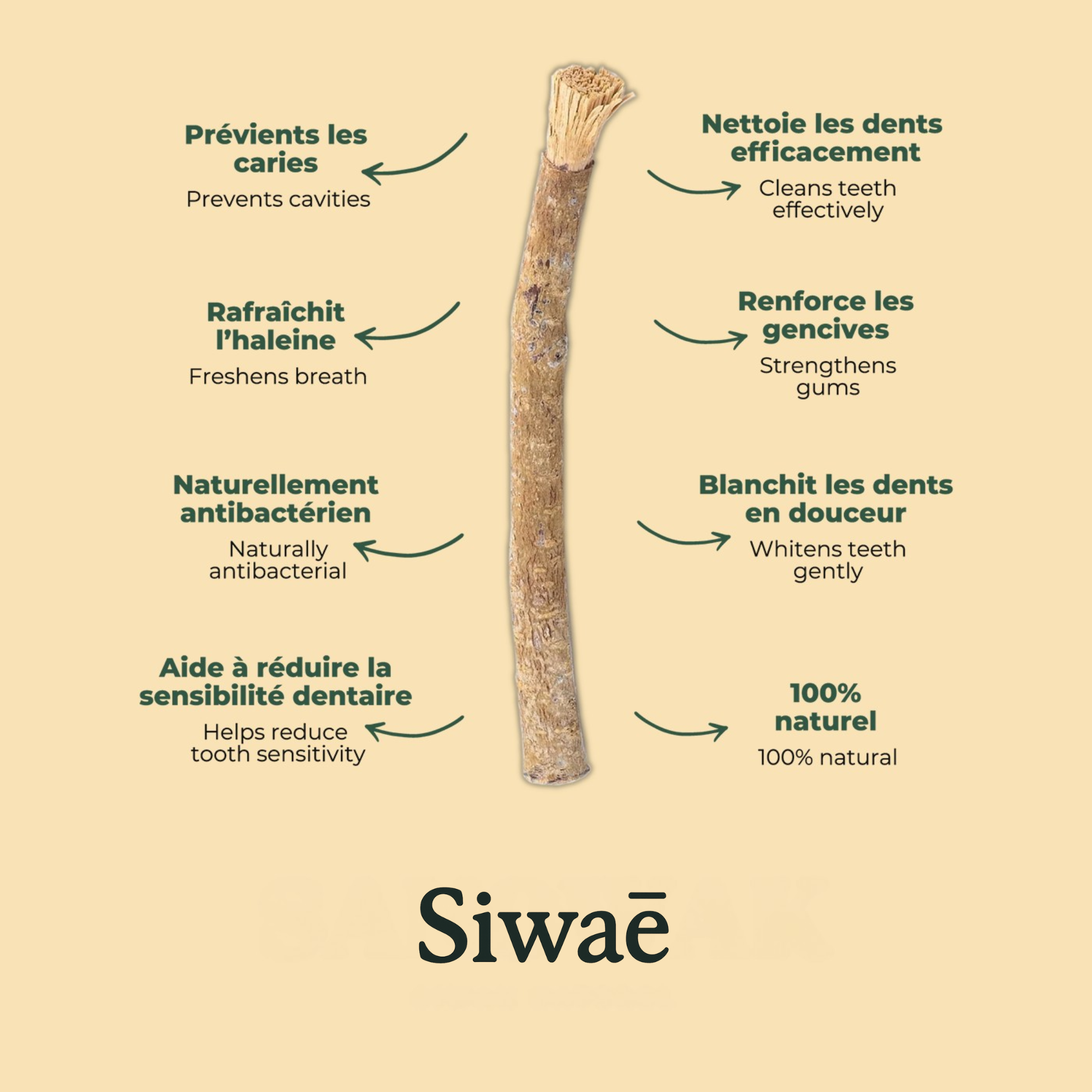 Le siwak contient des agents naturels qui apaisent les gencives, réduisent la sensibilité et nettoient sans irriter.
